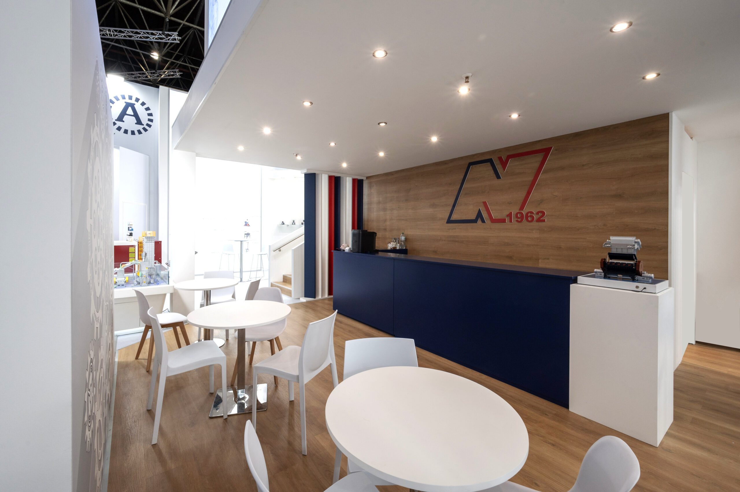 Disponendo di un solo lato aperto abbiamo dovuto immaginare uno spazio che si estendesse in altezza e che lasciasse un’aera libera all’esposizione dei macchinari. Come sfruttare il soppalco quindi? Attraverso uno studio ad hoc degli spazi abbiamo pensato di spostare al piano superiore – accessibile da una elegantissima scala rivestita con le stesse finiture dello stand – gli uffici riservati alle trattative più “importanti” ed in generale ai meeting che sono frequenti durante eventi du questa portata.